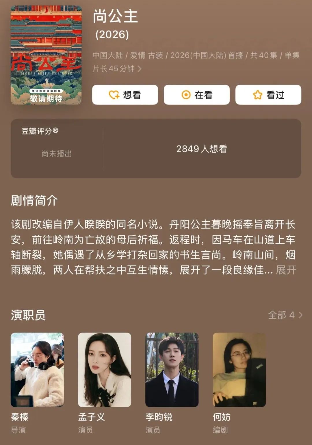 网传他们会二搭影视剧《尚公主》,本月22号可能官宣,豆瓣该剧的演职员名单,目前写着孟子义和李昀锐。