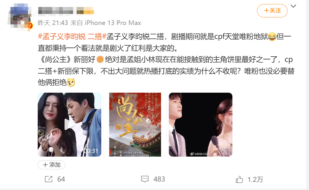 有网友认为《尚公主》按网传的资料介绍,称得上是“好饼”,但也有两家唯粉内心抗拒。