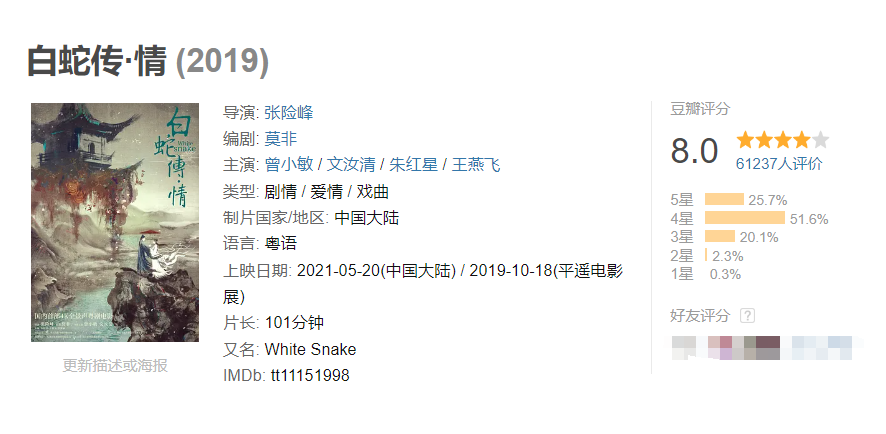 在当初上映短短20天内便打破中国戏曲电影的票房纪录,更斩获第19届中国电影华表奖“最佳故事片”的殊荣。《白蛇传·情》在受众层面更是成功“破圈”,迄今在B站播放量超过2000万,凭借绝美国风和现代表达受到大批年轻观众的喜爱和推崇。豆瓣8.0的分数,是观众对这部作品的肯定,更是对粤剧电影这种形式的初步尝试的赞许。