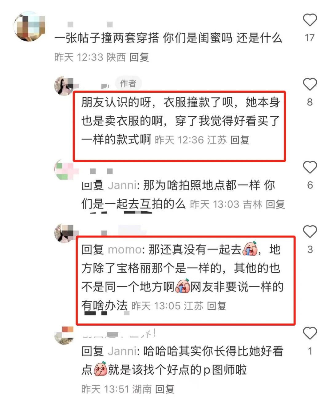 小姐姐回复网友,说叶珂有自己的牌子在卖衣服,她觉得好看就买了,撞衫了。关于是不是在同个地方拍照的,小姐姐表示没有一起去,只是刚好有一次都在一个地方拍的。