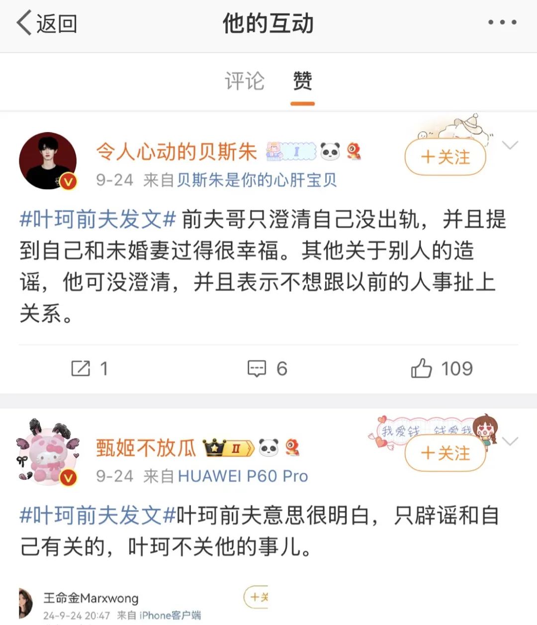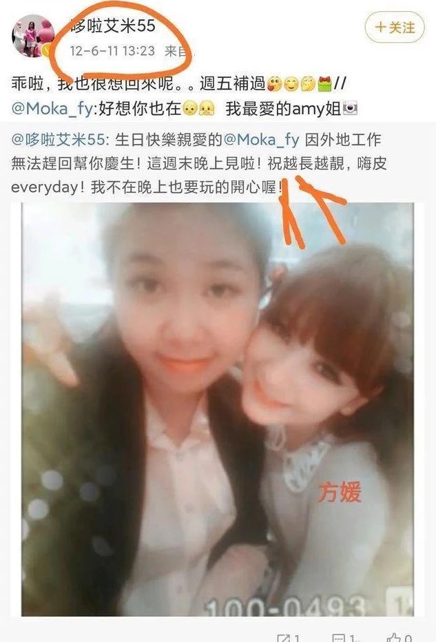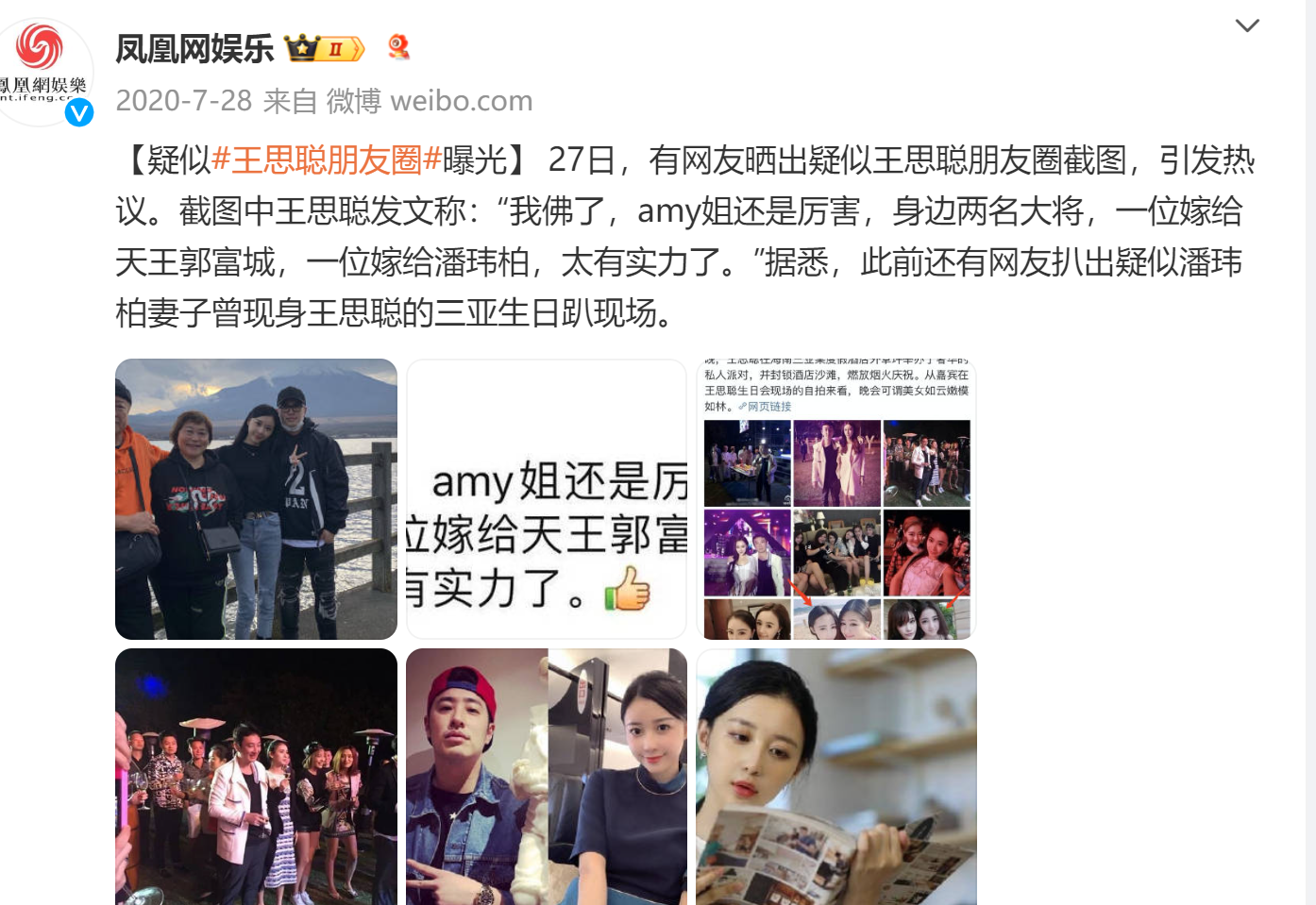此后,王思聪提到的“Amy姐”的微博被曝光。网友发现,“Amy姐”昔日曾与郭富城妻子方媛、潘玮柏妻子宣云(Luna)在不同聚会合影。