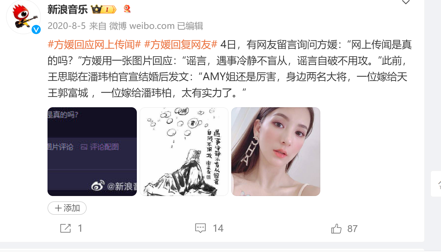 舆论发酵之后,潘玮柏工作室发布律师声明,郭富城也在出席活动时表示“这些是不实报道”,方媛本人回复网友否认。
