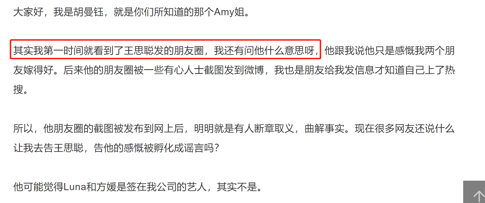 当时,Amy还接受了媒体采访,说她看完王思聪朋友圈,质问过王思聪。