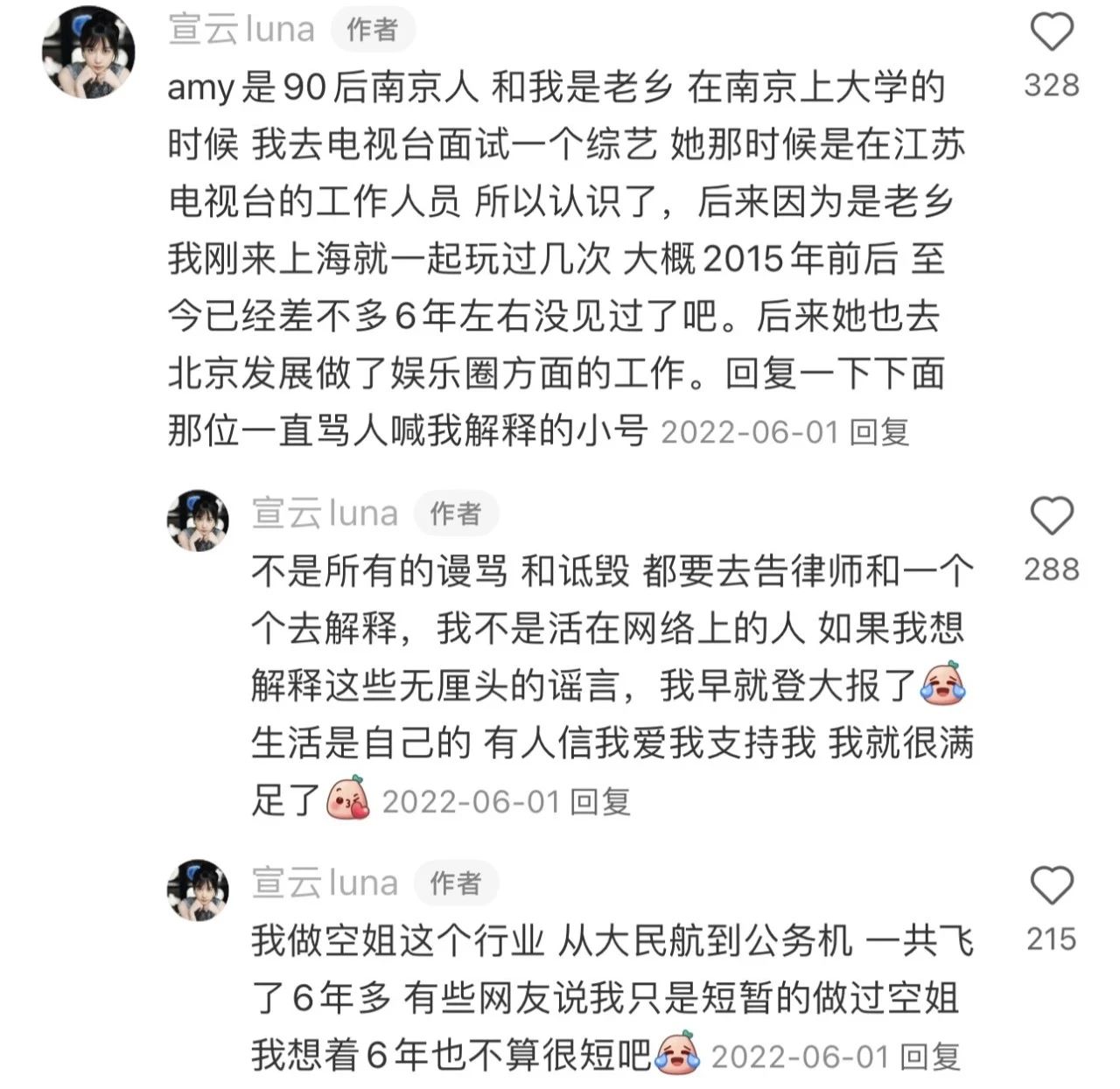 网传宣云只是短暂当了空姐,宣云表示自己从事了空姐工作六年,不算很短吧。