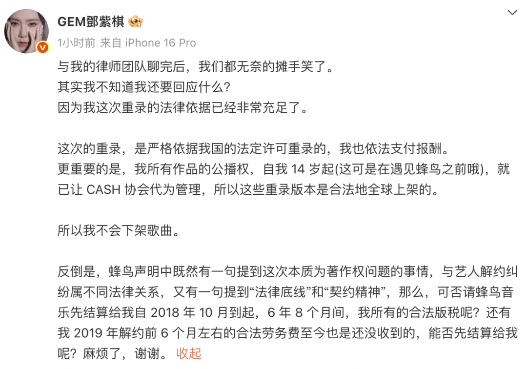 此前,针对邓紫棋近日发布的重录专辑《I AM GLORIA》,蜂鸟音乐发布关于音乐作品著作权归属的严正声明,称发现艺人邓紫棋女士于2025年6月12日在各在线音乐平台上线多首音乐制品重制版本,所涉歌曲(除《天空没有极限》《后会无期》《喜欢你》以外)均创作于双方合约期间,原版录音制品也发行于双方合约期间。所涉音乐作品、音乐制品在全球版权登记机构(IFPI)及国内各大音乐平台均明确标注相关权利人为蜂鸟音乐有限公司。