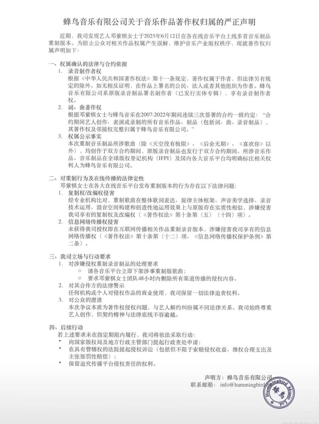 蜂鸟音乐表示,邓紫棋女士在各大在线音乐平台发布重制版本的行为存在侵害复制权/改编权、信息网络传播权的法律问题,要求各音乐平台立即下架涉事重制版歌曲,要求邓紫棋女士团队48小时内删除所有渠道传播的侵权内容。若上述要求未在指定期限内履行,将依法采取行动。(邓紫棋被指侵权!蜂鸟音乐要求其48小时内删除重录歌曲)