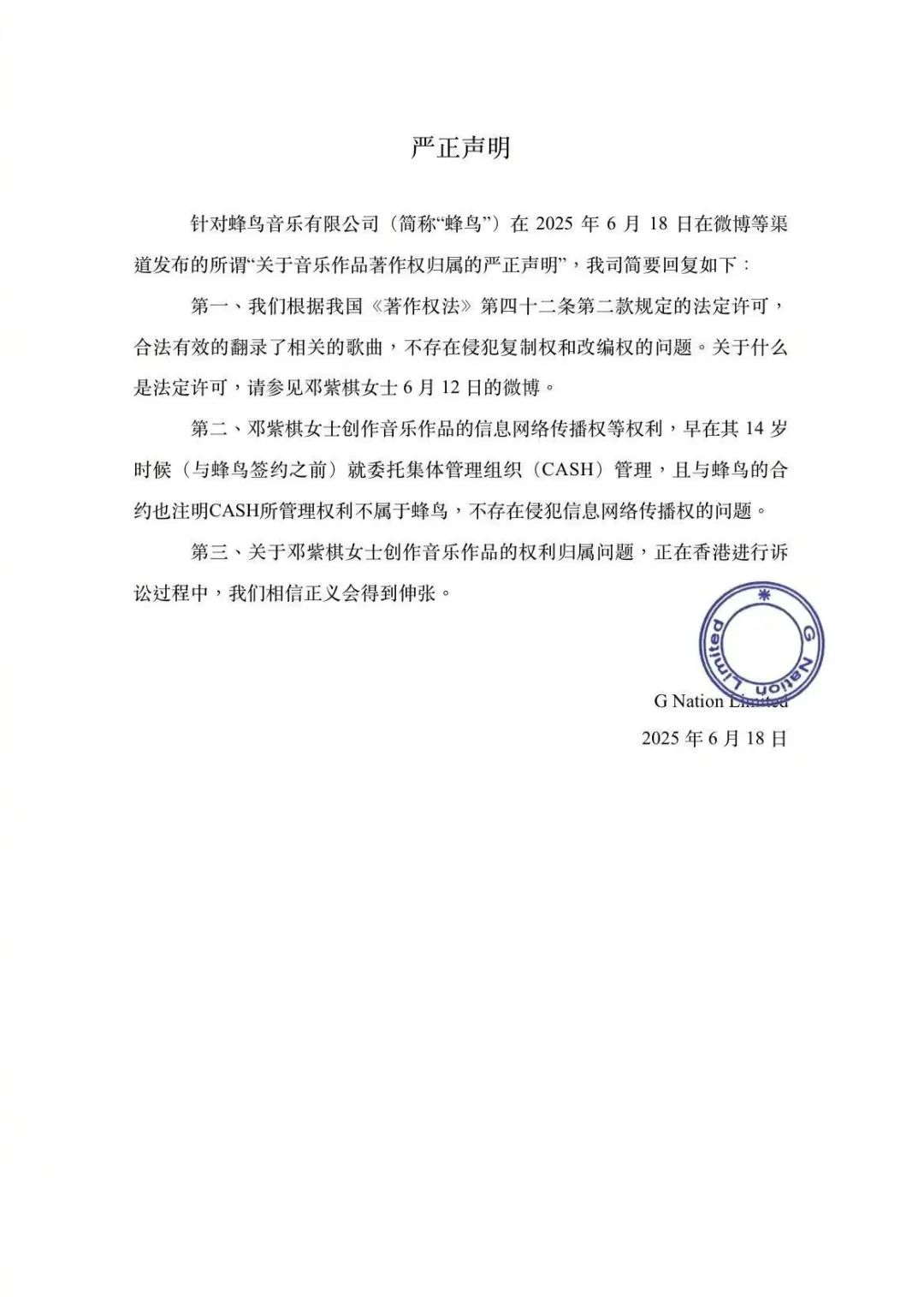 同日下午,邓紫棋所属公司对该声明作出回应,称根据我国《著作权法》第四十二条第二款规定的法定许可,合法有效翻录了相关歌曲,不存在侵犯复制权和改编权的问题。邓紫棋创作音乐作品的信息网络传播权等权利,早在其14岁时候(与蜂鸟签约之前)就委托集体管理组织(CASH,香港作曲家及作词家协会)管理,且与蜂鸟的合约也注明CASH所管理权利不属于蜂鸟,不存在侵犯信息网络传播权的问题。同时,提供了CASH对其拥有公开播放版权的确认函。