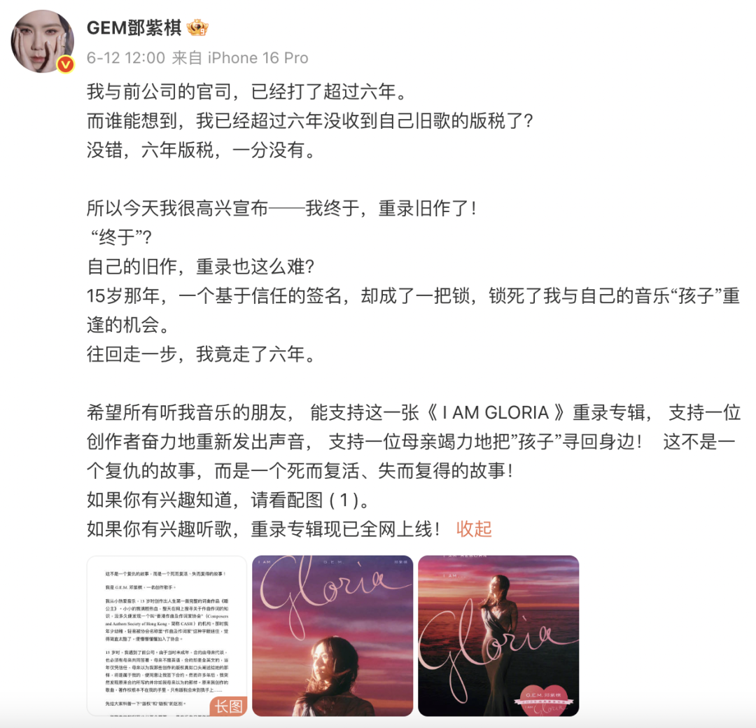 南都此前报道(6年无版税终迎合法重录!邓紫棋发长文讲述与前公司版权纠葛),6月12日,邓紫棋在社交平台宣布《I AM GLORIA》重录专辑全网上线,并发长文自述重录专辑的缘由,以及其与前公司长达超过6年的版权纠纷,称已超过6年没有收到自己旧歌的版税。
