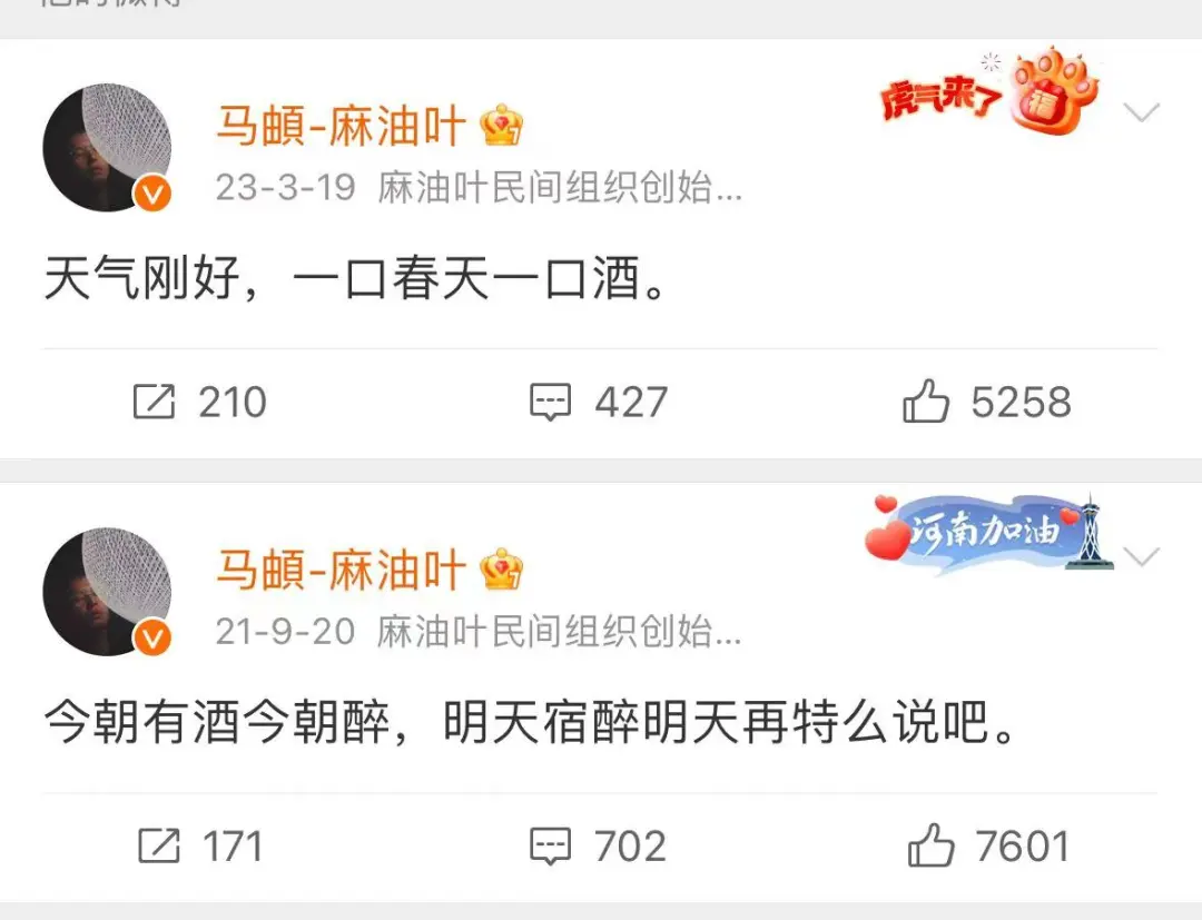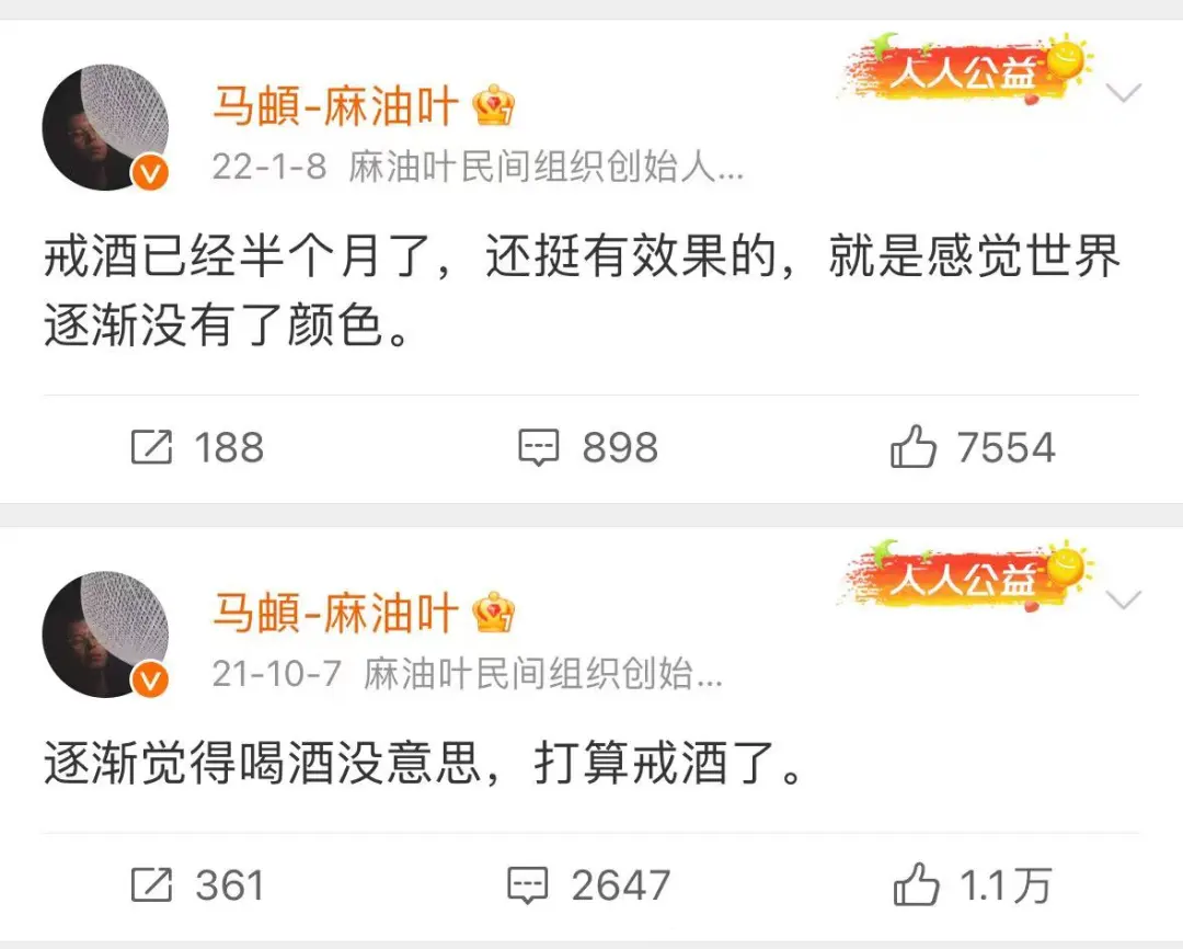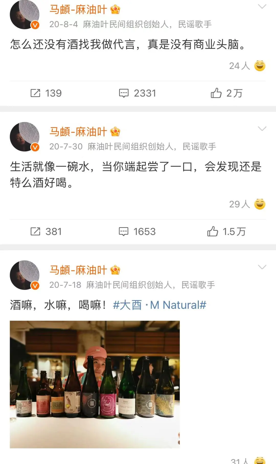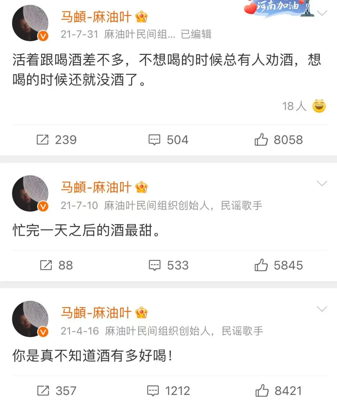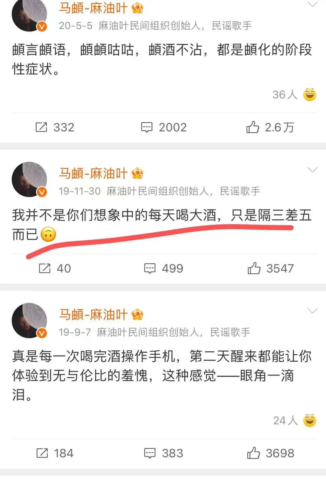 马頔经常发博提到喝酒,隔一段时间就发博表示想戒酒。