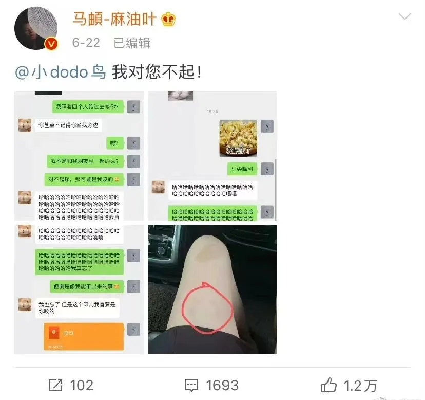 几年前,马頔发博分享喝酒后咬了豆得儿,还晒出两人聊天记录。豆得儿是王思聪前女友之一。