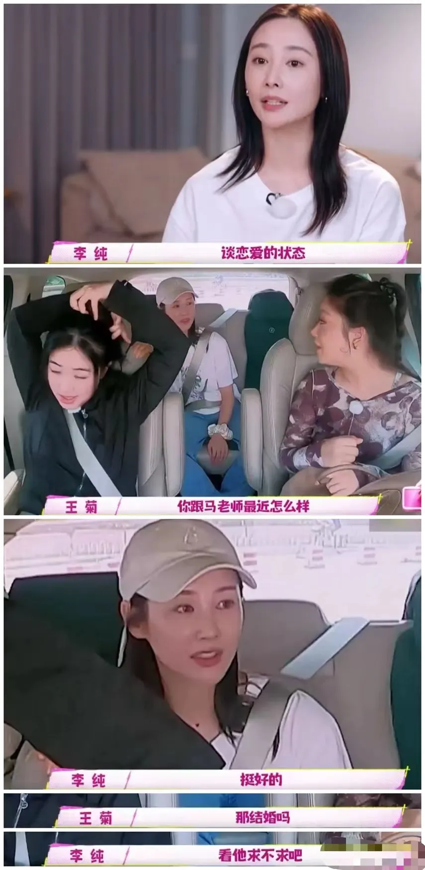 节目中,好友王菊问李纯最近和马老师怎么样,她说:“挺好的”,对于结婚的话题,李纯则回应:“看他求不求吧”,王菊更是打趣:“压力给到马老师这边”。