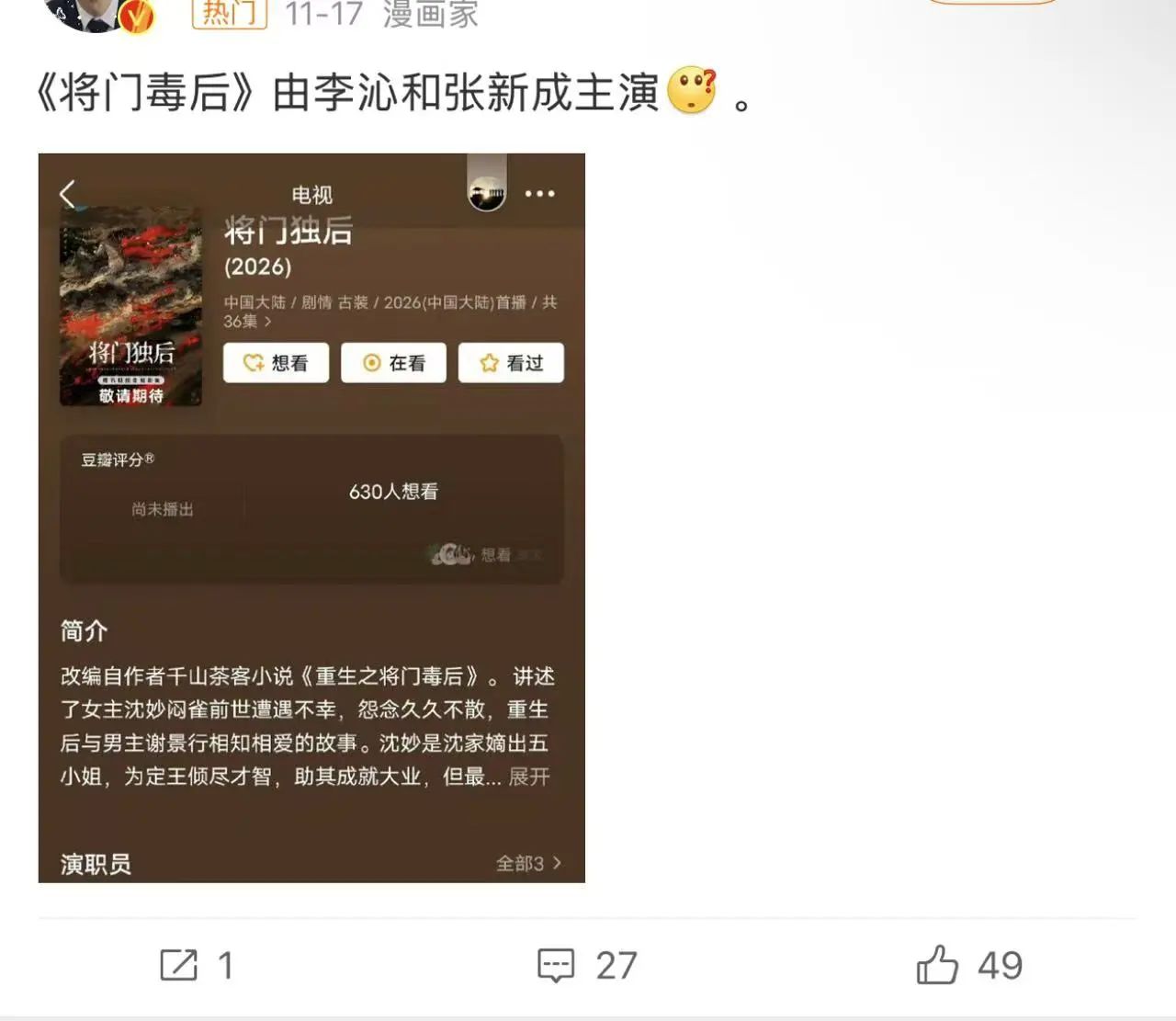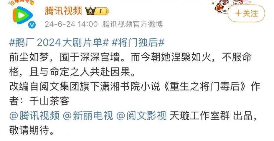 今年6月公布的腾讯视频2024大剧片单里,官宣了《将门独后》。10月,该剧入选2025鹅厂大剧片单。