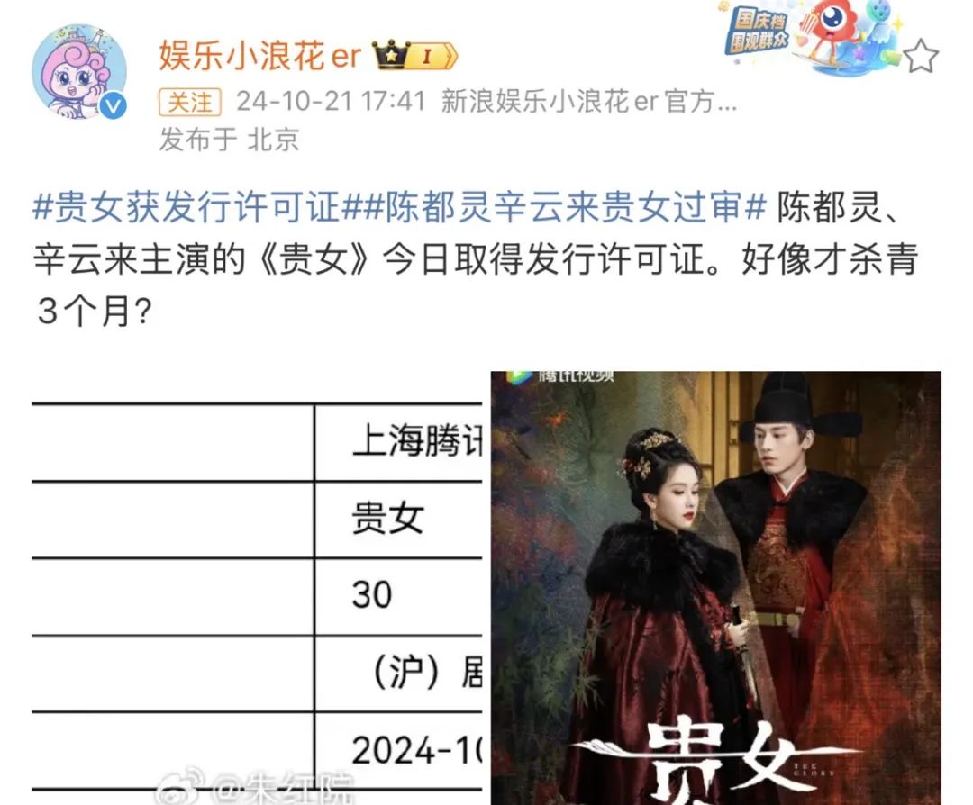 今年7月,《贵女》杀青。10月,这部剧就取得发行许可证,也出现在2025鹅厂大剧片单。