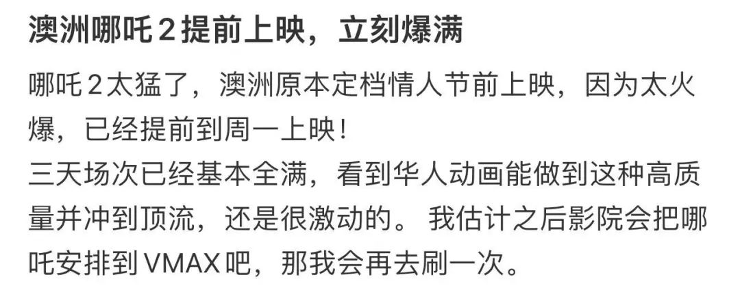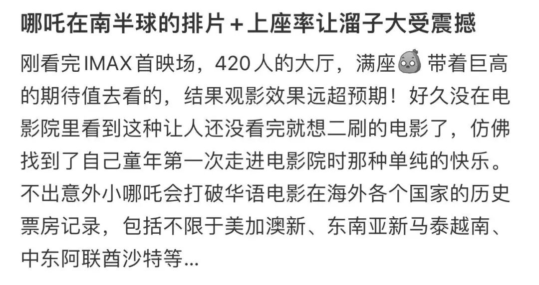 “眼看着影院一直在增加排片,依旧是场场爆满,到最后我们买的那场除了残疾人位置,一个空位也没有。”“哪吒请给澳洲留子一个机会,是我不想看吗,是每个电影院都满了啊。”“420人的大厅满座,在纽村呆了6年,从未见过引进的国产片能把整个影院撑爆。”