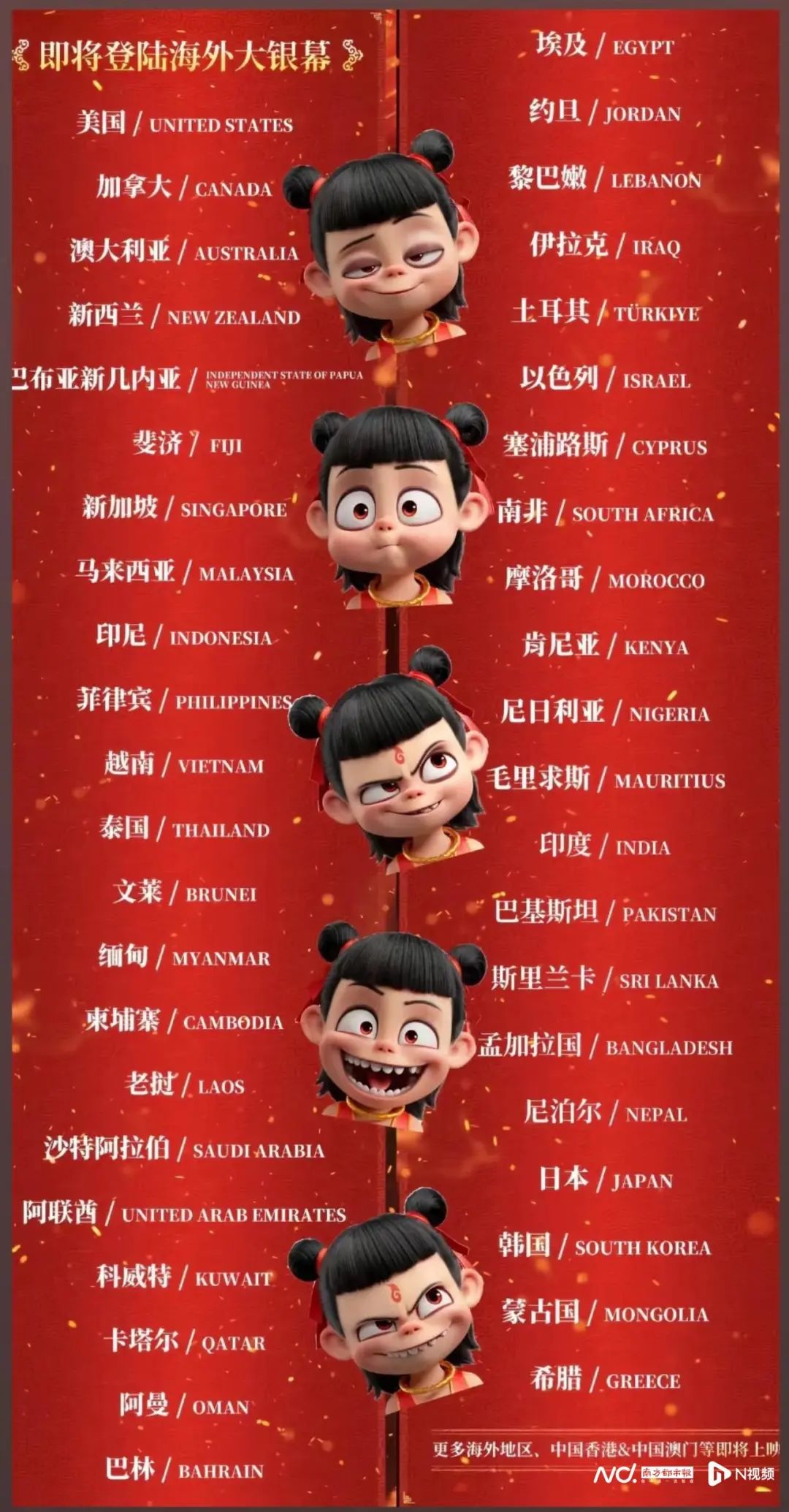 据了解,《哪吒2》将于2月13日在澳大利亚、新西兰、斐济、巴布亚新几内亚,2月14日在美国、加拿大正式上映。