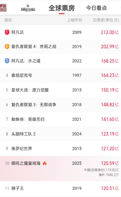 《哪吒之魔童闹海》自上映以来,票房成绩可谓是一路高歌猛进。2月17日,该片以120.52亿元超越《狮子王》,位居全球影史票房榜第十位。这也是全球影史票房前十里唯一一部非好莱坞电影。