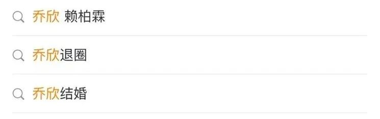 现在在微博搜“乔欣”,搜索栏上关联了赖柏霖的名字,以及退圈、结婚等相关词。