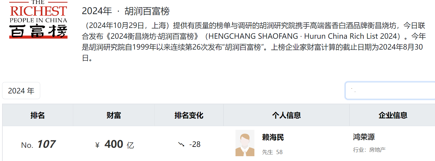 在2024年的胡润百富榜上(上榜企业家财富计算的截止日期为2024年8月30日),赖海民排在107位,财富400亿。赖海民是广东普宁人,鸿荣源集团创始人,鸿荣源素有宝安豪宅专家称号。