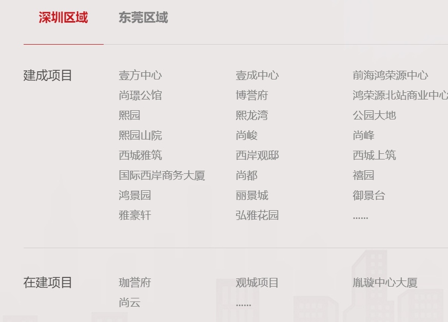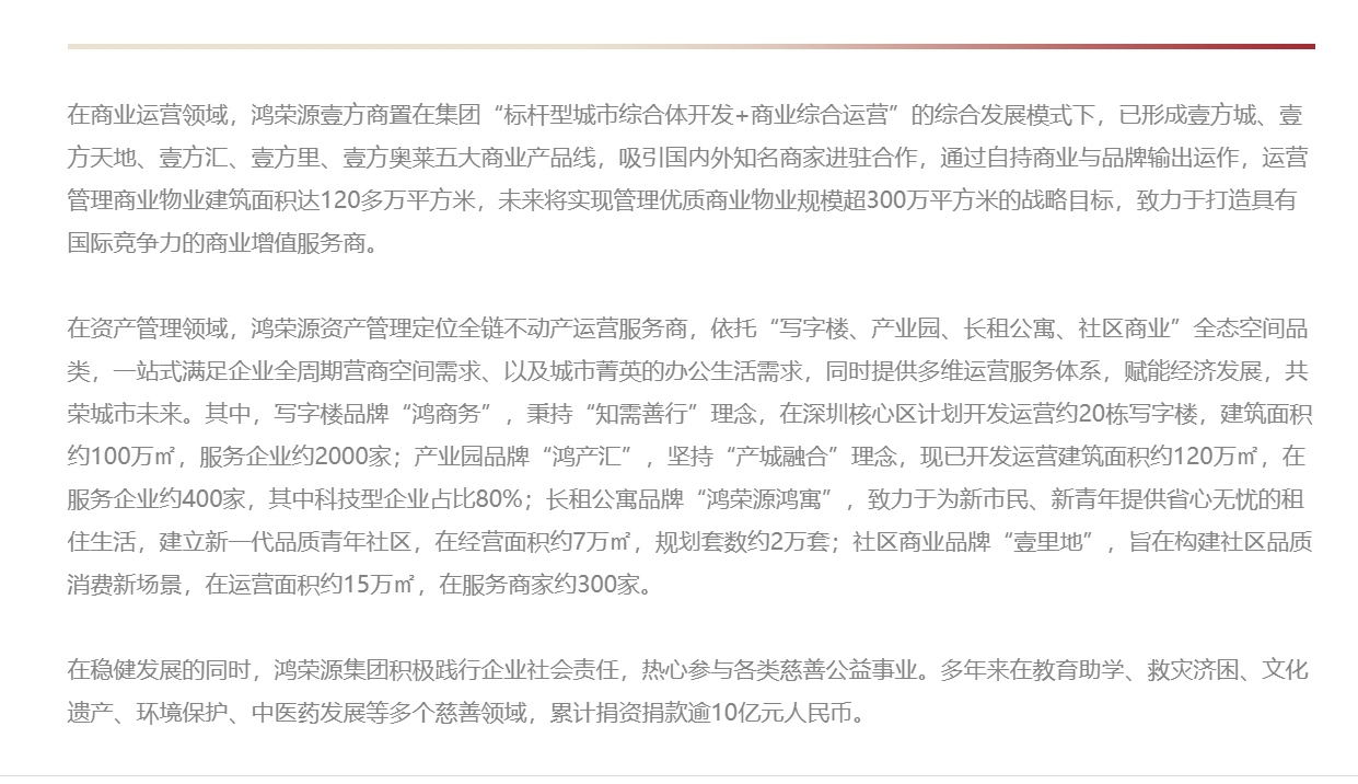 在地产综合开发领域,鸿荣源集团多年来坚持投身粤港澳大湾区建设一线,依托深圳,深耕湾区,累计综合开发房地产建筑面积逾千万平方米,筑造前海鸿荣源中心、前海壹方中心、龙华壹成中心、香蜜湖熙园、龙岗公园大地等多个极具市场影响力的标杆项目……