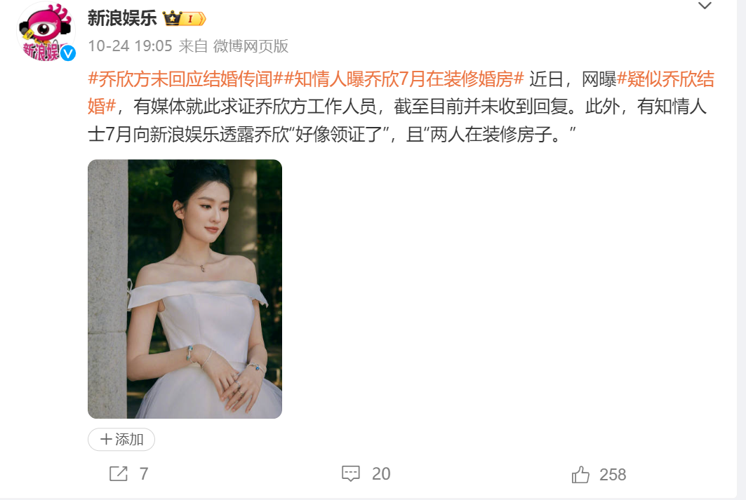 有媒体就结婚消息求证乔欣工作人员,并没有收到回复。此外,有知情人士7月向新浪娱乐透露乔欣“好像领证了”。