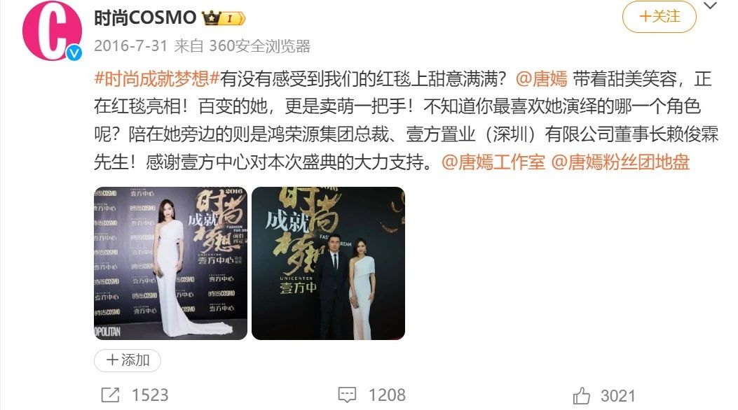 2016年时尚cosmo盛典,唐嫣和赖俊霖先生合影,时尚cosmo发文感谢壹方中心的大力支持。