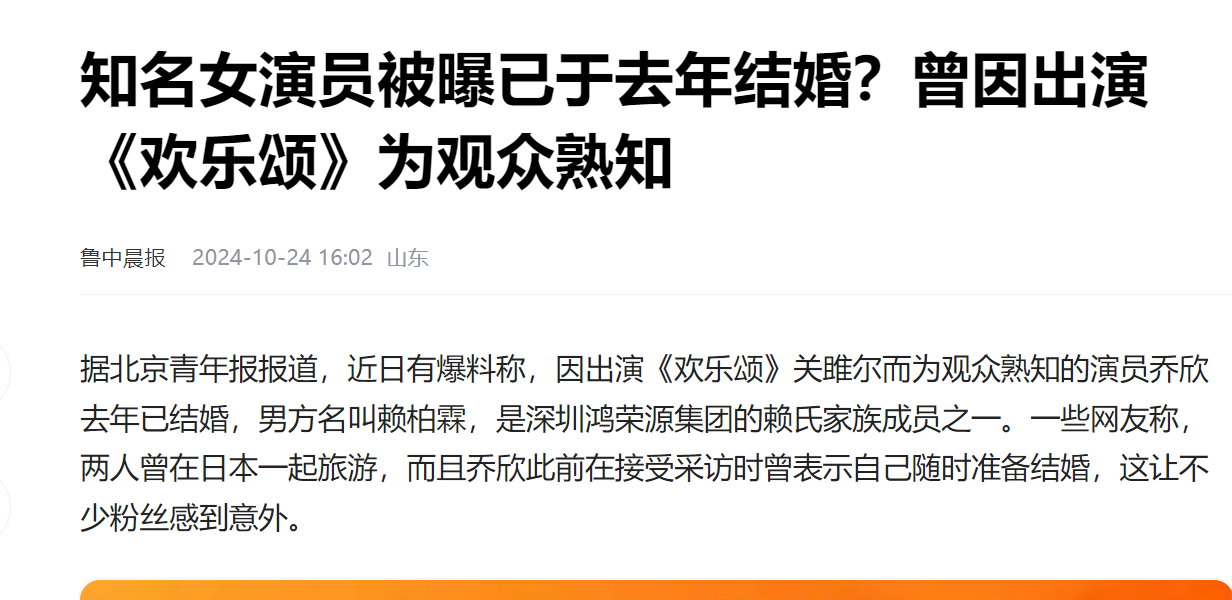 10月份,据北京青年报报道,有爆料称,演员乔欣去年已结婚,男方名叫赖柏霖,是深圳鸿荣源集团的赖氏家族成员之一。
