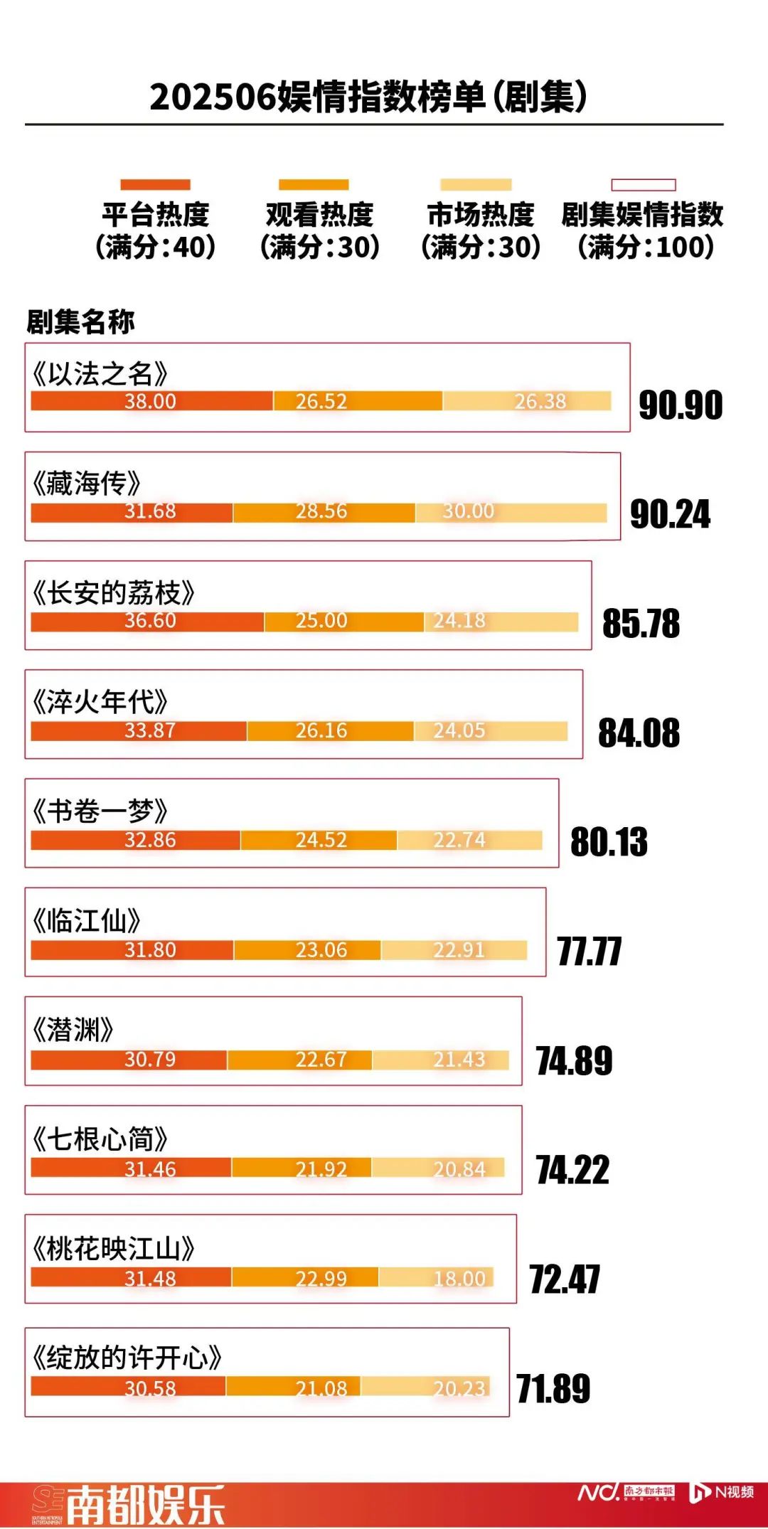 在剧集分榜,6月迎来收官的《藏海传》表现依旧强势,凭借优异的市场热度和观看热度,以及不俗的口碑(豆瓣7.1分),依旧保持90以上的高分,但其榜首之位已被取代。由张译、李光洁、蒋欣等主演的检察侦查剧《以法之名》以更好的口碑(豆瓣7.7分)和更高的网络平台播放量,在“平台热度”维度优势明显,并助其成功登顶。《长安的荔枝》则因各维度的平均表现而跻身三甲。《书卷一梦》《临江仙》《桃花映江山》等古装剧也悉数上榜。一同位居榜单前十的还有时代剧《淬火年代》、谍战剧《潜渊》等。