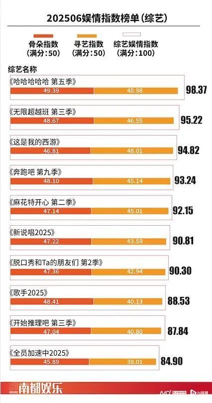 又到暑假。在一年一度的暑期档里,有哪些电视剧与综艺节目给你留下深刻印象呢?在最新一期的娱情指数中,两套在6月开播的热剧《以法之名》和《长安的荔枝》强势进入前三,前者更超过此前的领跑者《藏海传》,成为剧集分榜的新冠军。时代剧《淬火年代》则排名第四,《书卷一梦》《临江仙》《桃花映江山》等古装剧也进入榜单前十。而在综艺方面,《哈哈哈哈哈 第五季》表现强势,连续三期登顶分榜,《无限超越班 第三季》继续紧随其后,《麻花特开心》《脱口秀和Ta的朋友们》分别迎来第二季,开播后也顺利挤进前十。在热度与争议中前行的《新说唱2025》则排名第六。