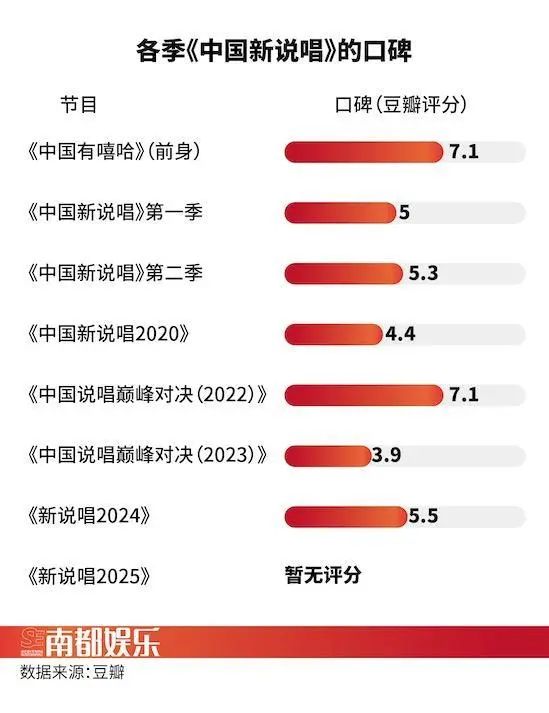 数据显示,这档由爱奇艺打造,被称为中文说唱综艺开山之作的节目,整体口碑呈下滑趋势。其前身《中国有嘻哈》保持了7.1的不错分数,但改名后的《中国新说唱》第一季只有5分,其后一路下滑。虽然在2022年一度跃升到7.1分,但下一季便断崖式下跌到3.9。本季的分数还没出来,但评论区已有不少打了1星、2星的网友,玩法没新意、导师经验不足、内容注水等成为了评论区的关键热词。