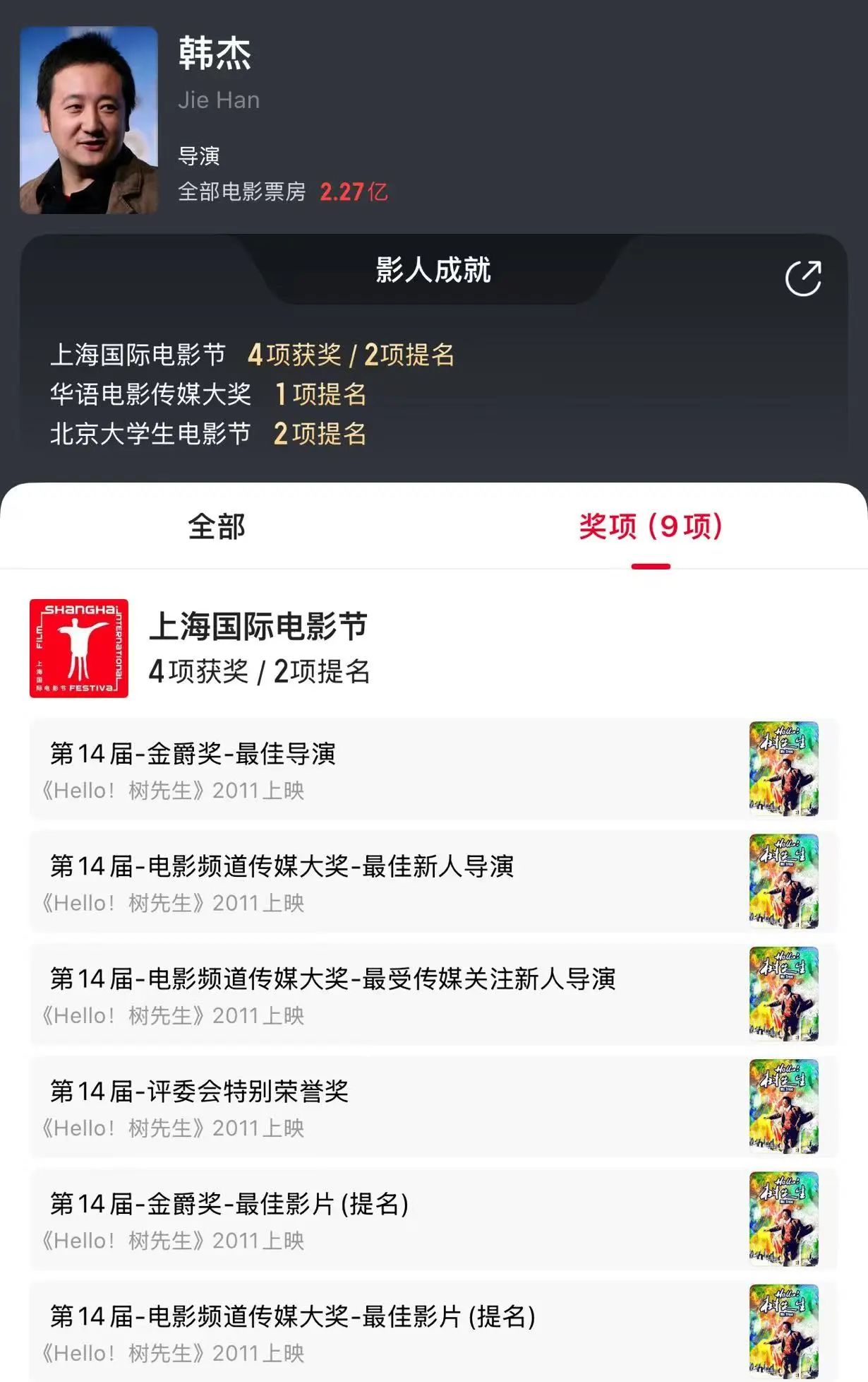 韩杰口碑最好的作品是2011年的《Hello!树先生》,斩获了上海电影节多个奖项,他获得了金爵奖最佳导演奖。