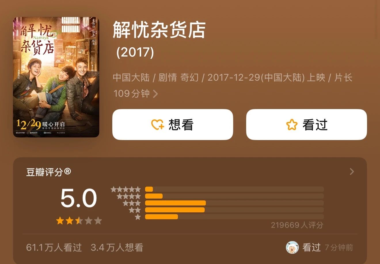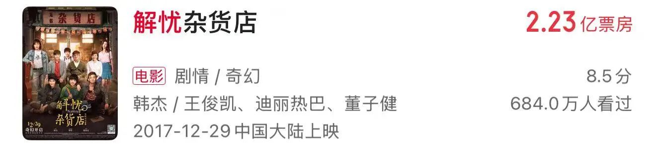 而同样是韩杰执导的《解忧杂货店》口碑很一般,豆瓣评分5.0分↓
