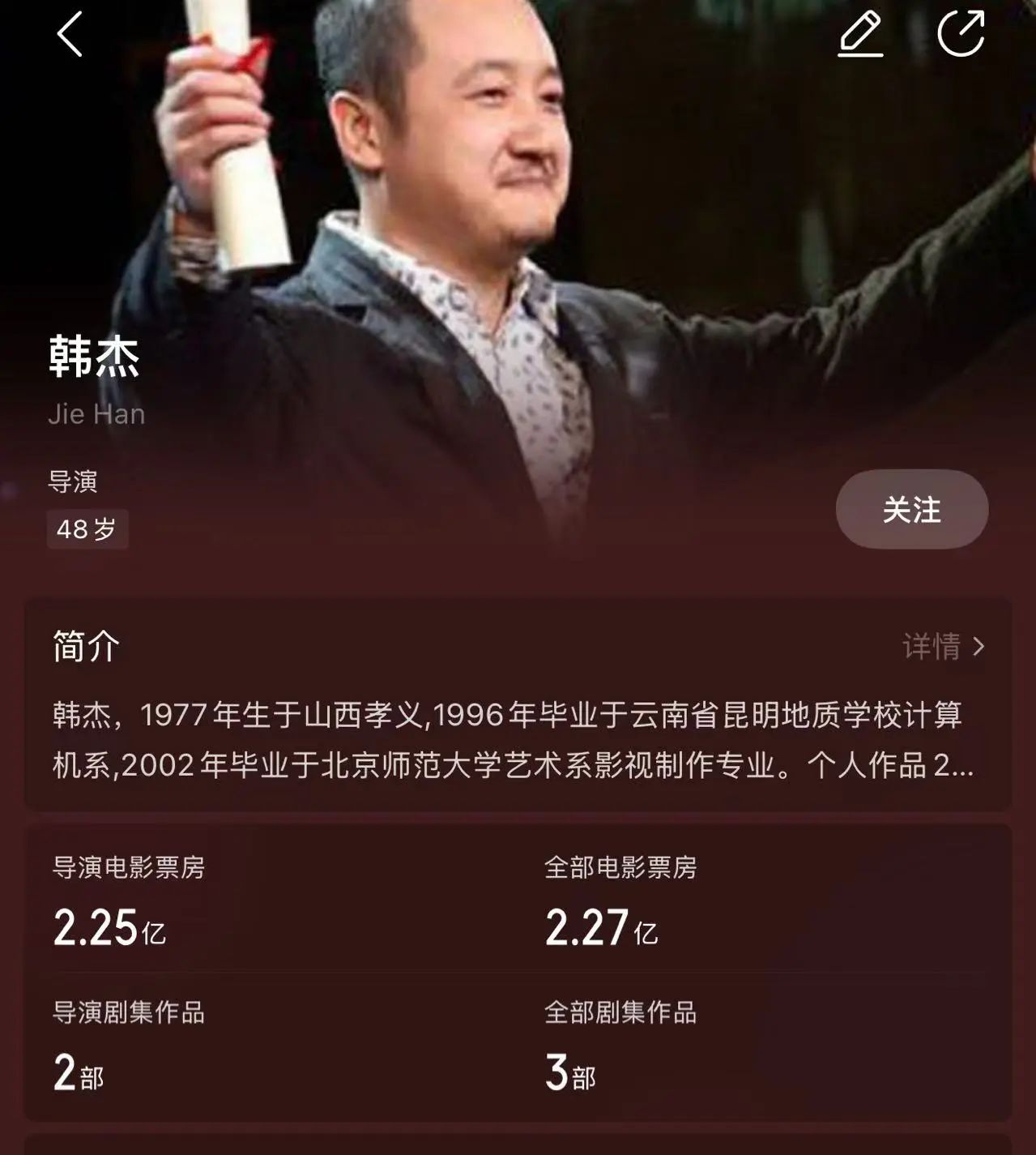 据悉,韩杰执导过的作品有《玩世英雄》《解忧杂货店》《Hello!树先生》《赖小子》等。