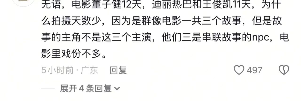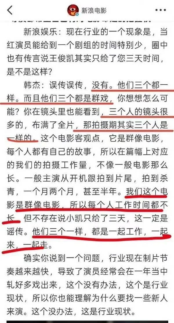 当年有传闻王俊凯只给了韩杰导演三天的拍摄时间,韩杰导演帮王俊凯辟谣,说三个主演拍摄期一样,因为是群像电影,所以每个人的工作时长都不长。