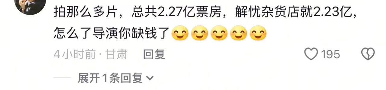 虽然评价一般,但这部电影是韩杰导演作品中票房最高的。根据猫眼电影,韩杰执导的作品票房总和2.25亿,其中这部《解忧杂货店》票房达2.23亿。