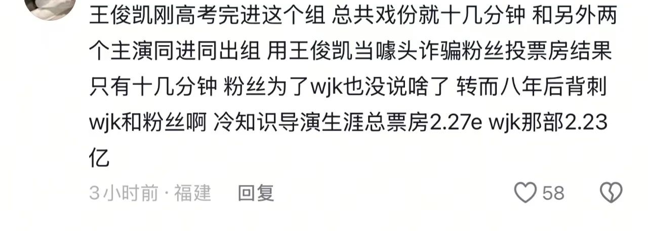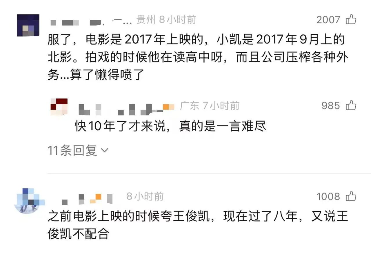 有网友认为王俊凯在片中戏份不多,所以给出的档期时间也不长;有人认为导演既然选择流量演员出演,就要衡量口碑和票房的关系,不要拍完了再甩锅;还有人提到导演n年前对王俊凯的评价可不是这样的。