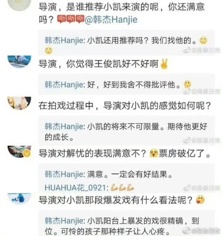 有媒体发现,当年宣传期时,导演回复网友的话对王俊凯各种夸赞。