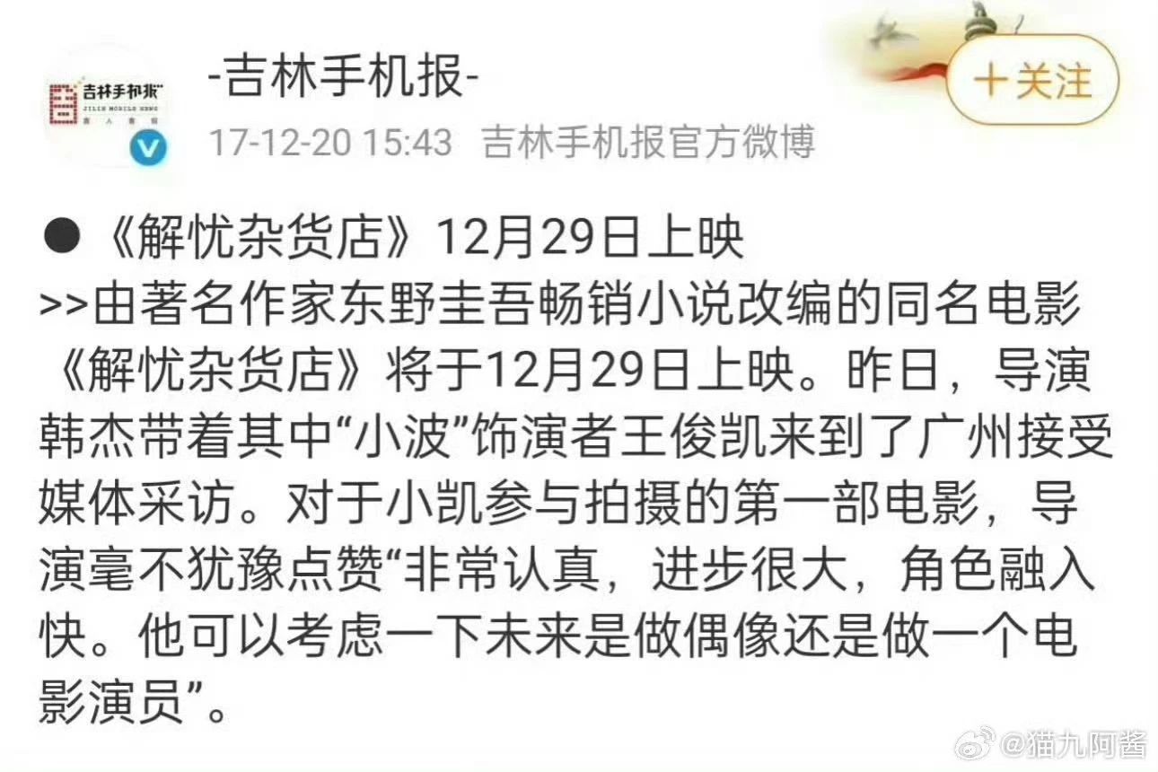 据悉,电影《解忧杂货店》于2017年12月29日全国上映,由日本著名作家东野圭吾同名小说改编,韩杰执导,王俊凯、董子健、迪丽热巴、秦昊等主演。