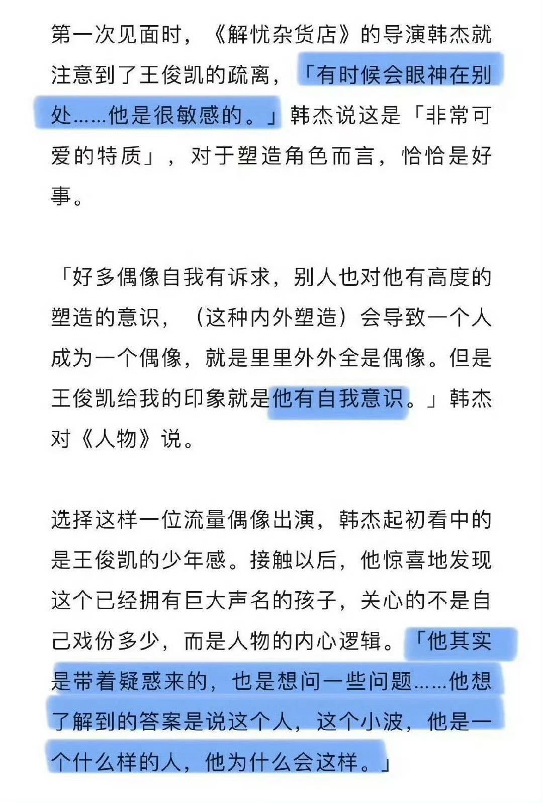 2018年《人物》报道王俊凯的文章里面,提到了韩杰导演觉得王俊凯的眼神给他很敏感的感觉,觉得是可爱的特质,对塑造角色是好事。