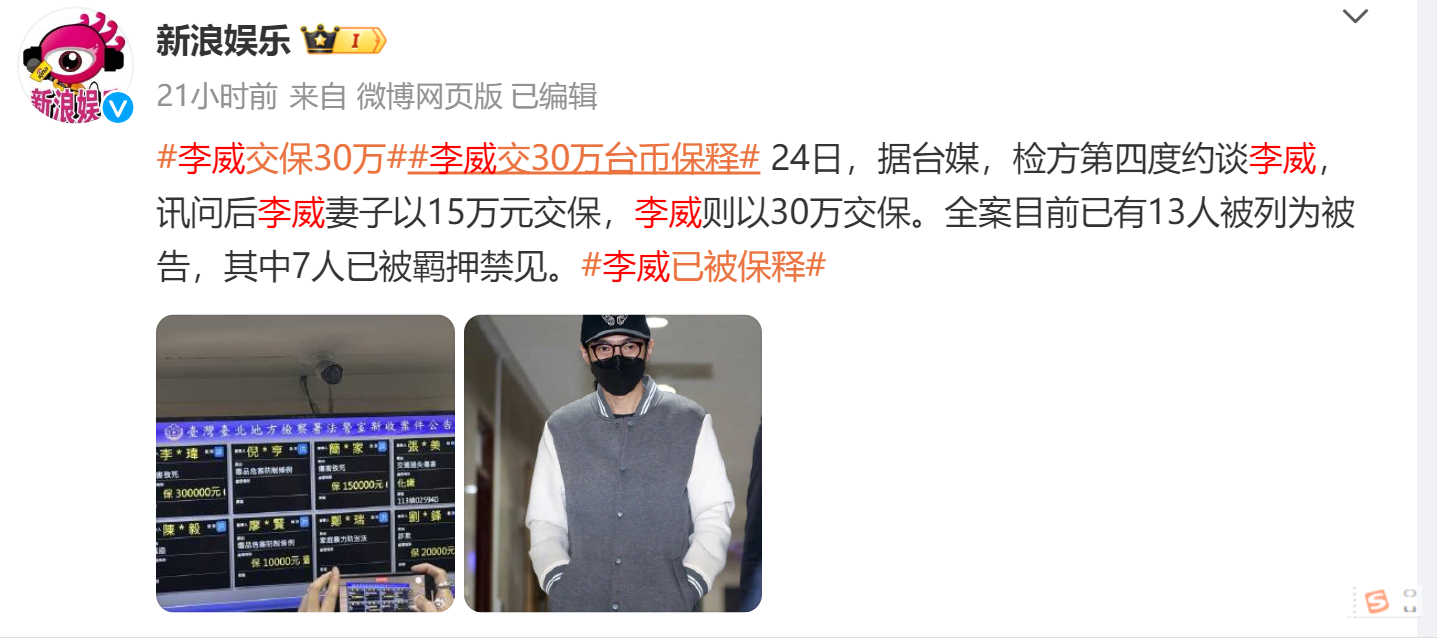 目前,李威夫妻二人均被保释。据台媒,李威妻子以15万元交保,李威则以30万交保。