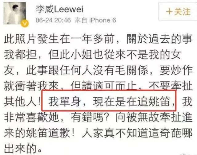 李威发博否认该女生是自己女友,并表示单身,正在追姚笛。