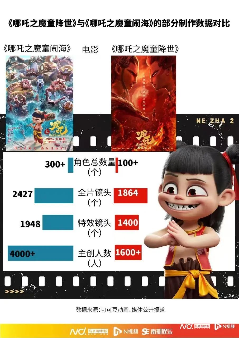 南都记者通过数据,对比了两部《哪吒》的制作规模与部分资源。