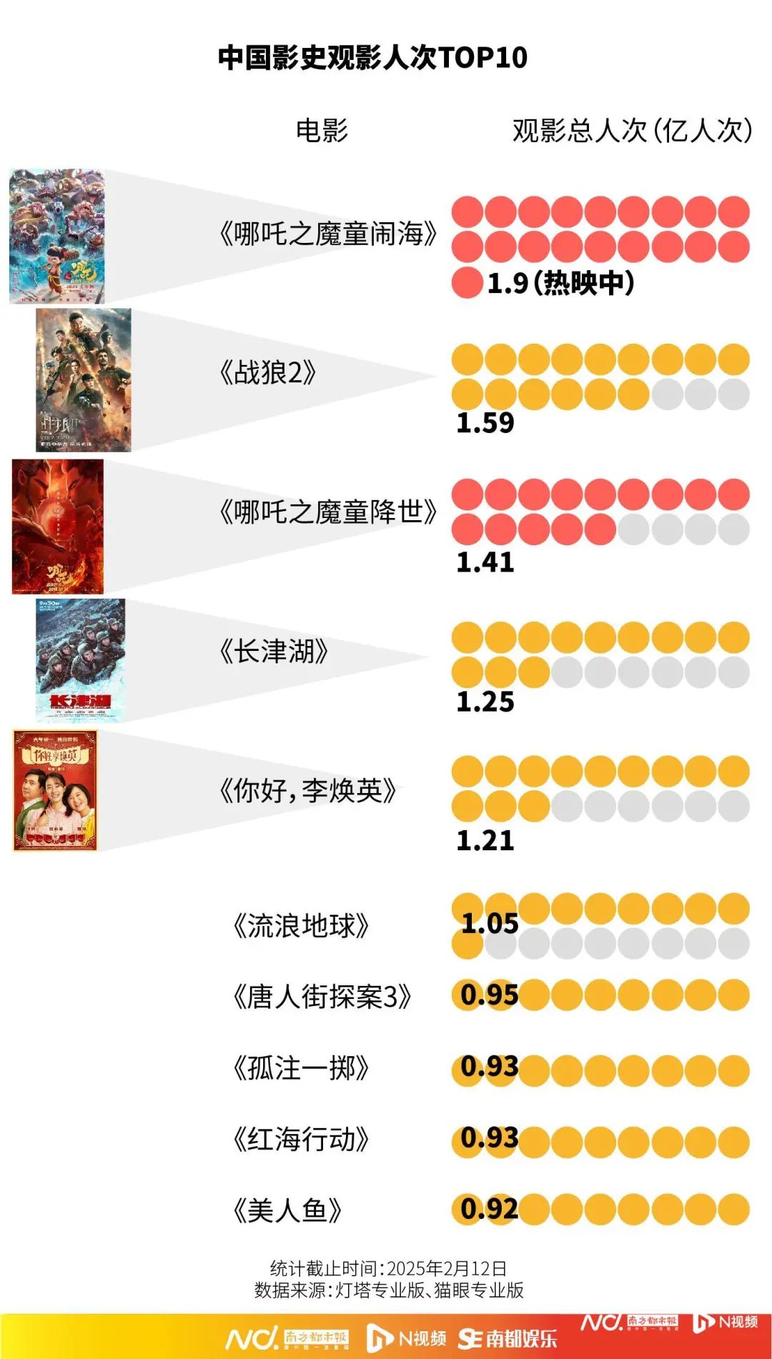 除了票房,《哪吒2》同样登顶中国电影观影人次榜。据灯塔专业版显示,截至发稿时,已有超1.9亿人次观影该作品。