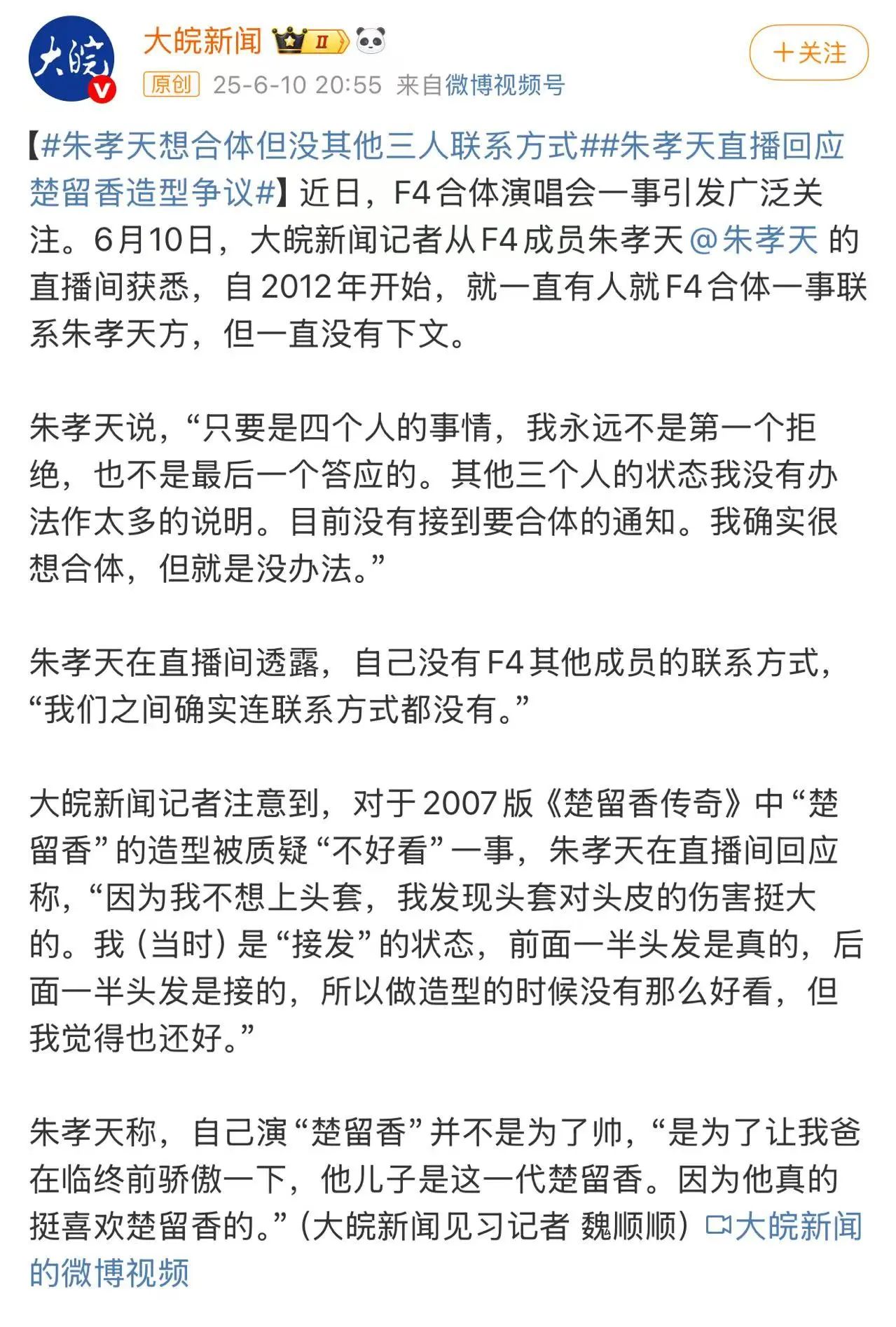 这次合体前不久,朱孝天在直播中回应提问时称:“只要是四个人的事情,我永远不是第一个拒绝,也不是最后一个答应的”、“我们之间确实连联系方式都没有”