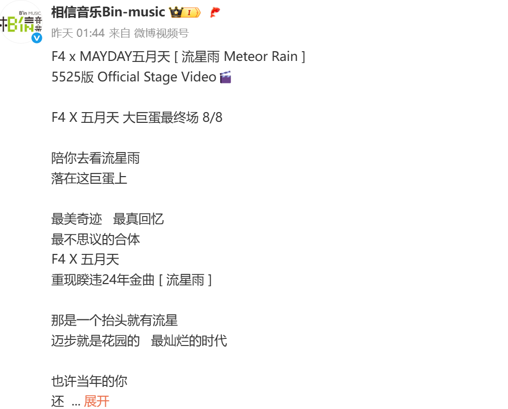 最近台北大巨蛋的五月天演唱会上,最大惊喜是阿信请出“特别嘉宾”,《流星雨》前奏骤然响起,言承旭、周渝民、吴建豪、朱孝天现身,冲上了热搜。