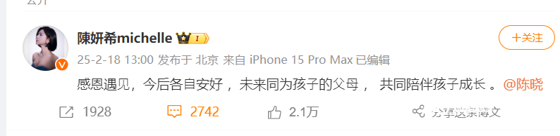 2月18日中午,被传婚变已久的陈晓和陈妍希通过微博发声,宣布离婚。双方文案统一:“感恩遇见,今后各自安好,未来同为孩子的父母,共同陪伴孩子成长。”