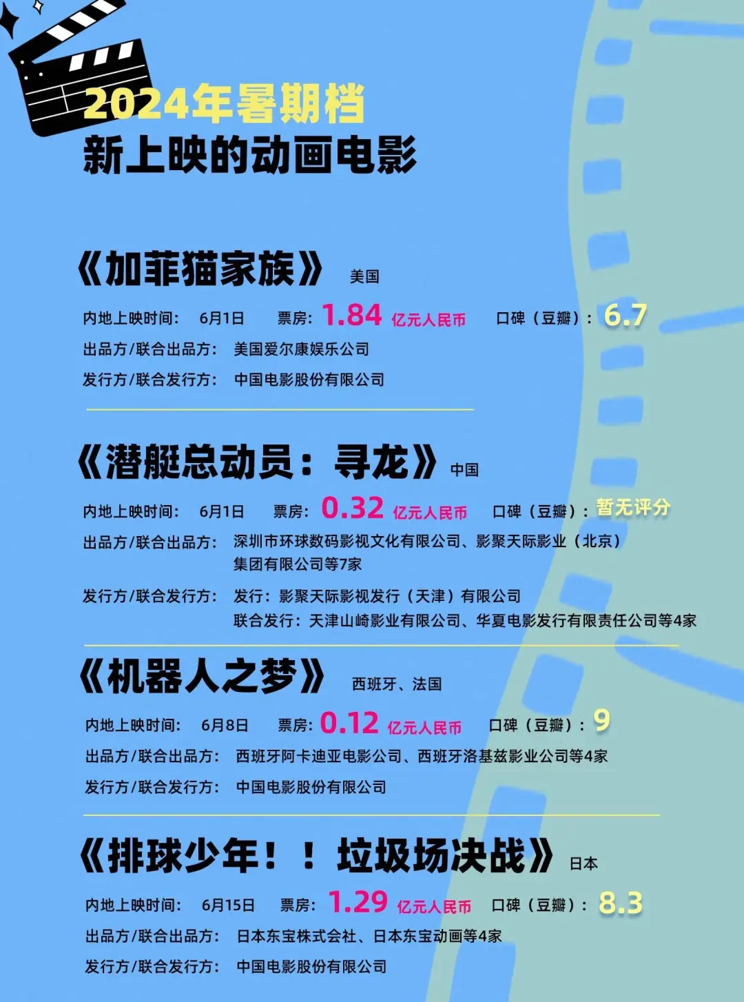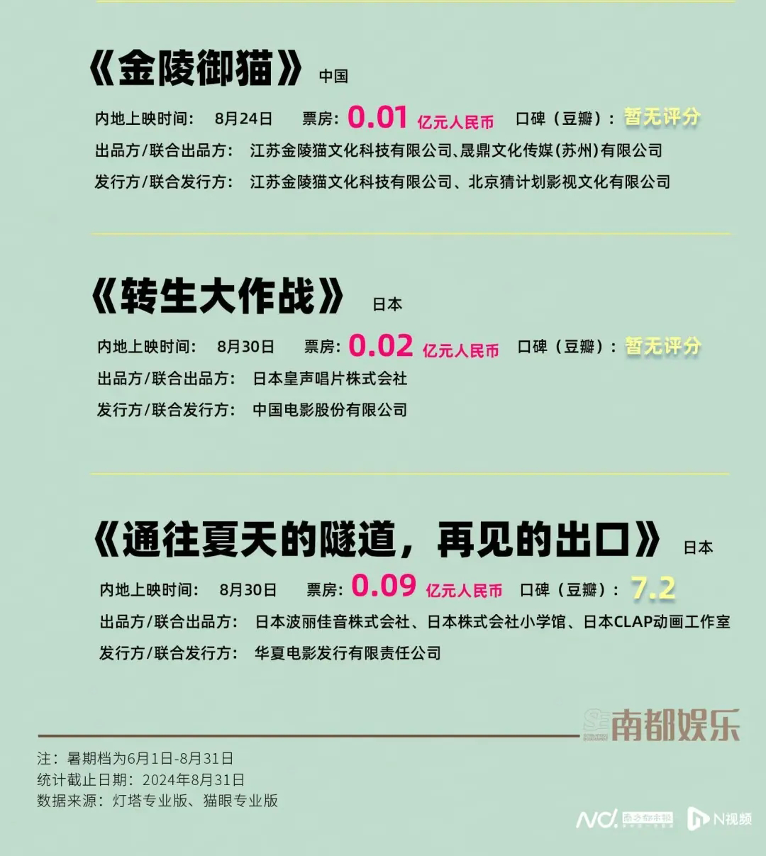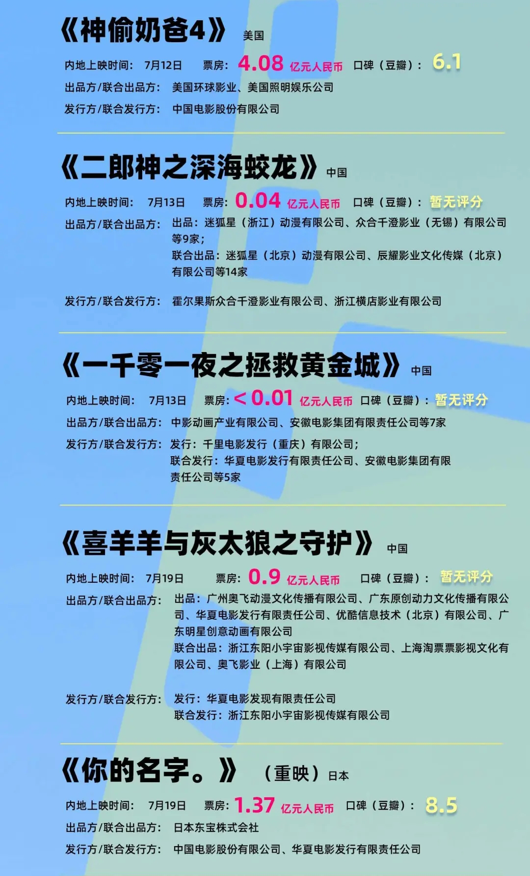 数据显示,《神偷奶爸4》以4.08亿元领跑今年的暑期档动画电影票房,排名第二的是《白蛇:浮生》的3.91亿元。排第三到第六位的都是外国动画,分别是《头脑特工队2》《名侦探柯南:百万美元的五棱星》《加菲猫家族》和《排球少年!!垃圾场决战》。《神偷奶爸4》的累计票房排名今年动画电影的第3位,仅次于《熊出没·逆转时空》(20.06亿元)、《你想活出怎样的人生》(7.91亿元),《白蛇:浮生》则紧随其后,排名全年第四。