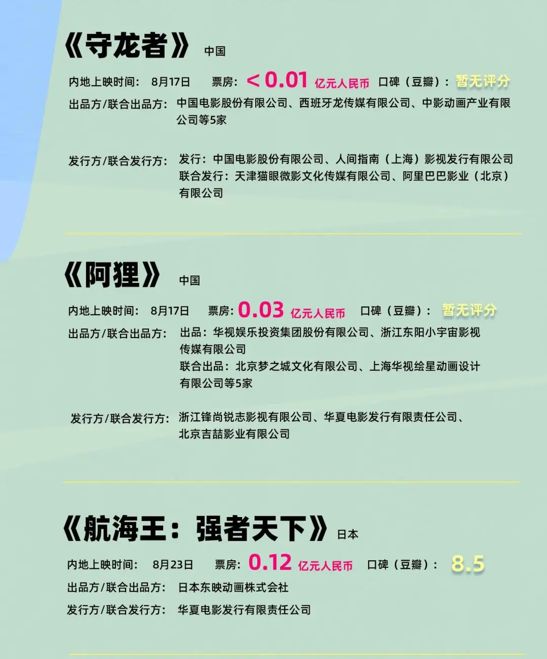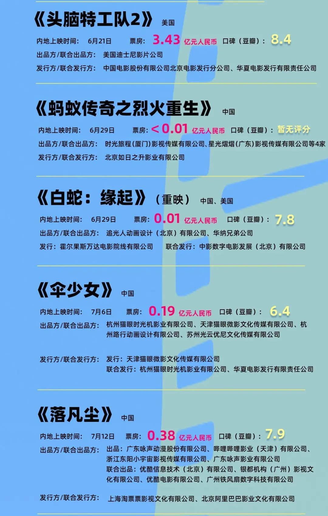 统计显示,共有25部动画电影在今年暑期档上映,其中12部为国漫,13部为引进的外国作品。再看时间,其中7部在6月和观众见面,国漫与引进片各占半壁江山。在7月上映的动画电影有9部,占比一半,包括《伞少女》《落凡尘》《喜羊羊与灰太狼之守护》等观众期望值较高的作品。《白蛇:浮生》《名侦探柯南:百万美元的五棱星》《航海王:强者天下》等9部动画则定档8月。