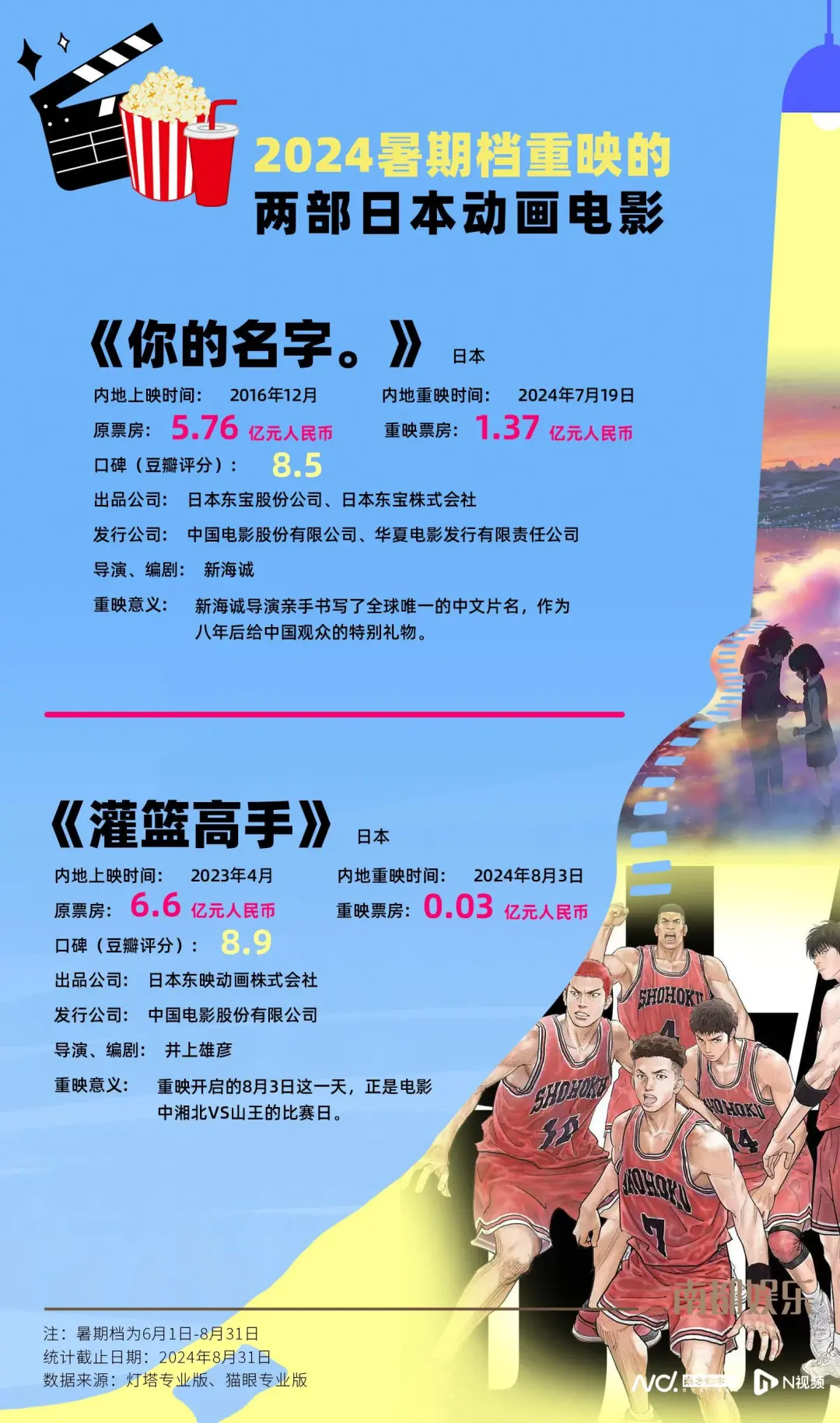 南都记者观察留意,有两部日本动画电影在今年暑期档进行了重映,分别是《你的名字。》和《灌篮高手》。