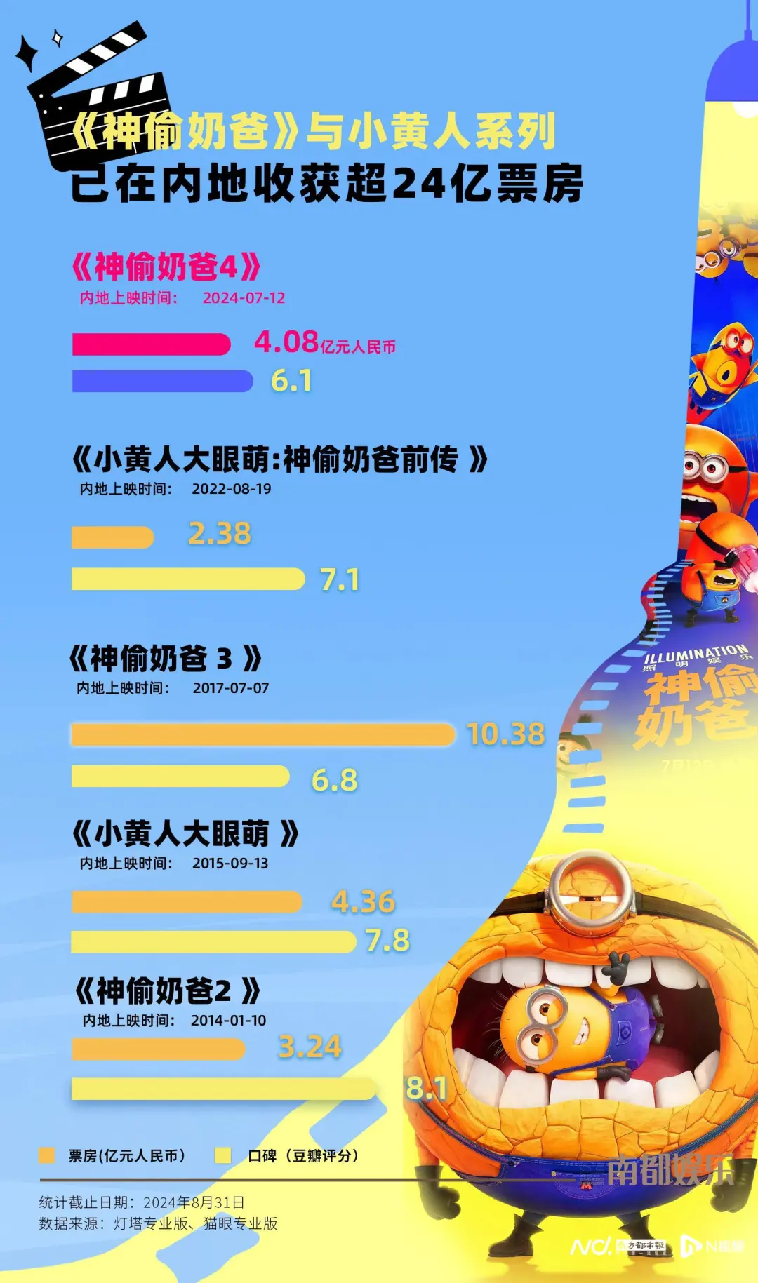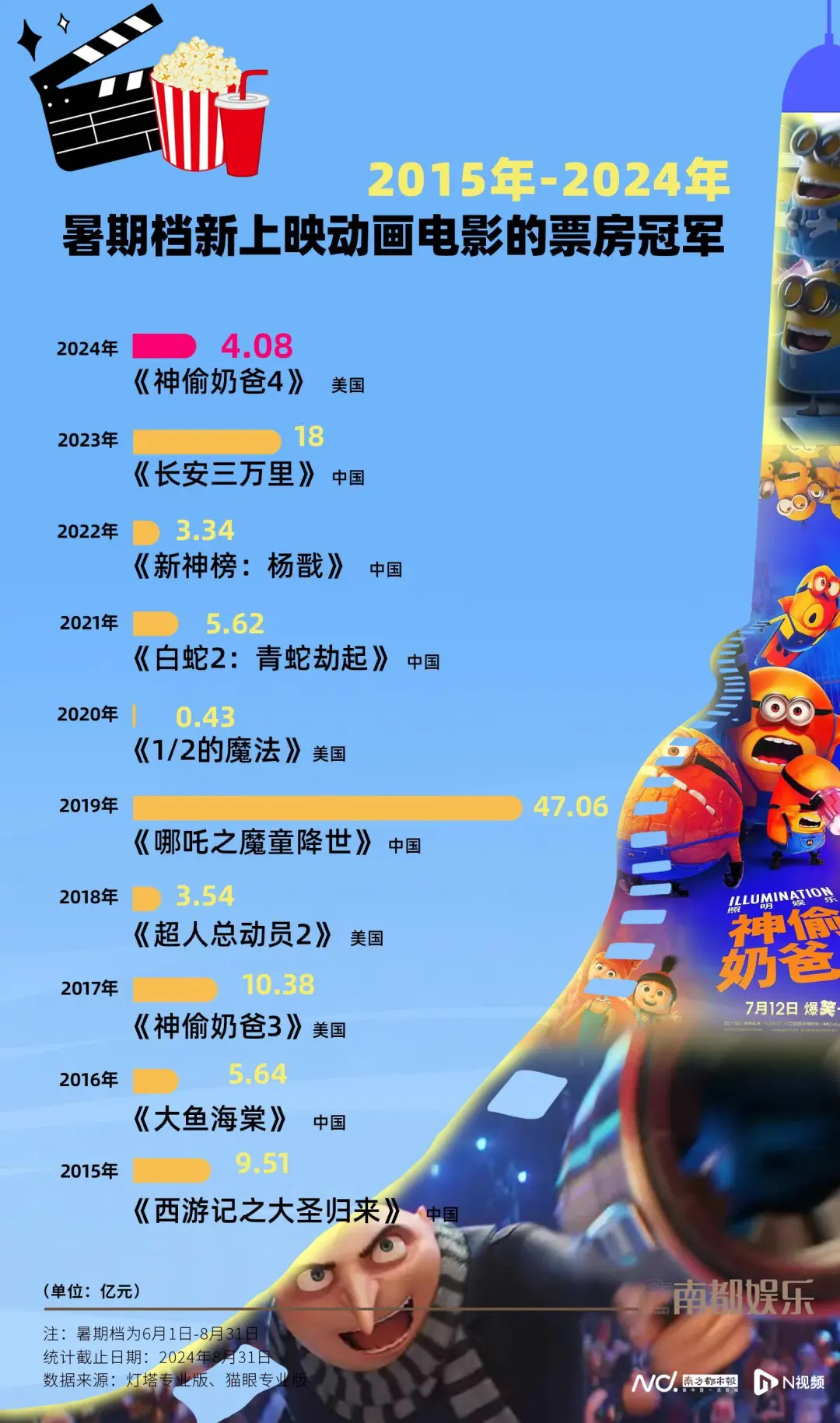 今年暑期档,《神偷奶爸4》以不到2000万元的优势力压《白蛇:浮生》,登顶动画电影票房榜。这一成绩也让《神偷奶爸》成为全球首个总票房突破50亿美元的动画系列。