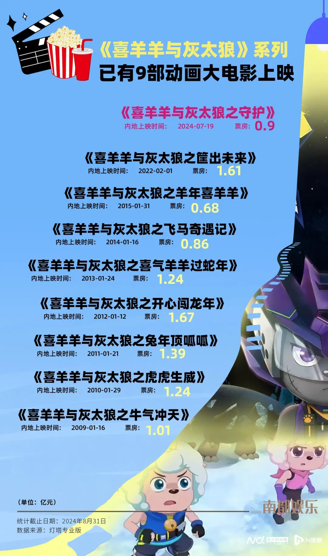 据观察,这是《喜羊羊与灰太狼》大电影首度进军暑期档,前八部都在春节档前后上映。由黄伟明担任总监制,黄俊铭、陈力进执导的《喜羊羊与灰太狼之守护》早在7月13日和7月14日开启超前点映。但上映一个多月以来,累计票房还没破亿,比2年前的《喜羊羊与灰太狼之筐出未来》低了7000多万元。